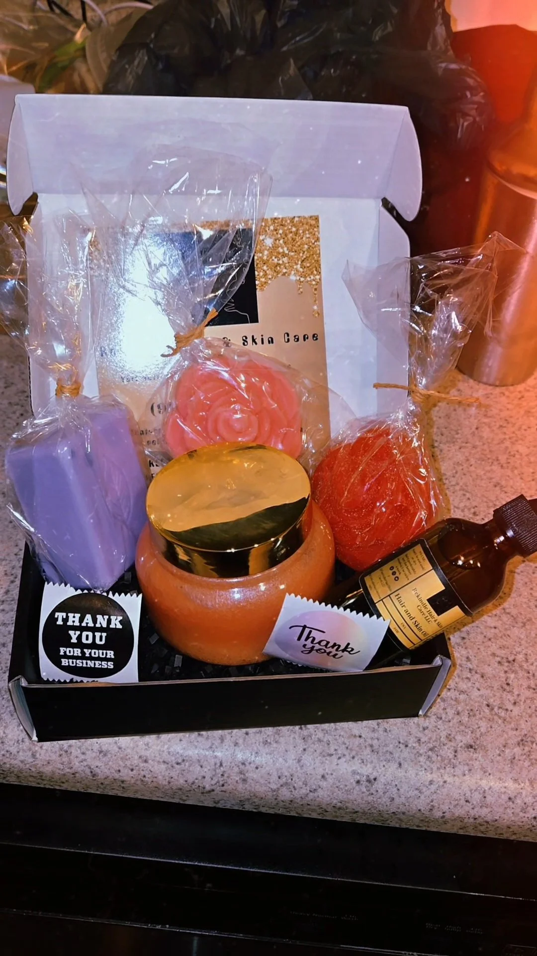GIFT BOX WITH SUGAR SCRUB, HAIR GROWTH OIL, AND THREE SOAP BARS(LAVENDER, ROSE ,AND CHERRY BLOSSOM)